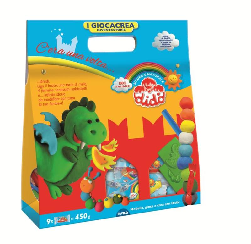 CF DIDO’ C’ERA UNA VOLTA DRUDI – contiene 9 salsicciotti Dido’, 4 formine,1 coltellino,1 mattarello, 1 tovaglietta gioco e 1 cartoncino con elementi da staccare.